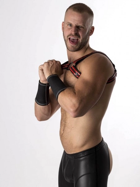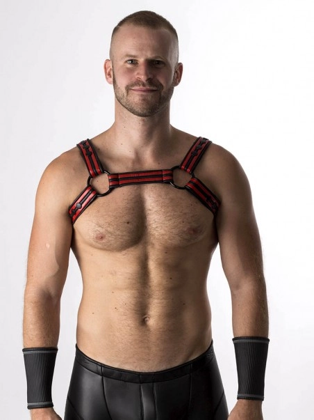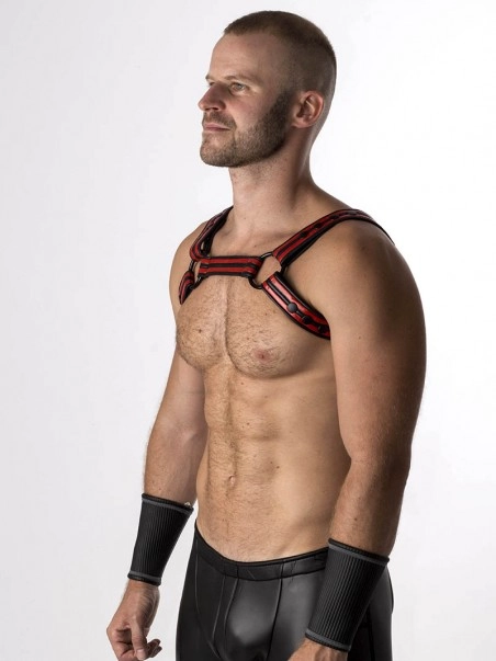 Pratique pour les plan uro, mais aussi pour le clubbing, le harnais Bulldog en Nu00e9opru00e8ne est composu00e9 de doubles bandes caoutchoutu00e9es en couleur.