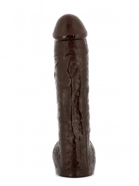 Gode ru00e9aliste avec ventouse en PVC doux moulu00e9 sur l’acteur X Bam. Couleur brune.u00a0