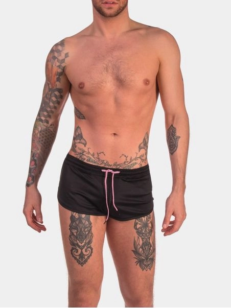 Le short taille basse est u00e9quipu00e9 d’une ceinture u00e9lastique avec cordon de serrage, d’une poche plaquu00e9e u00e0 l’arriu00e8re avec l’u00e9tiquette surpiquu00e9e de la marque de vu00eatements gay. Il est fait dans tissu doux et respirant pour la peau.
