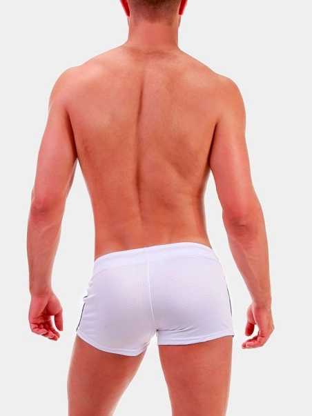 Notre mini short Timur de la marque allemande BarcodeBerlin fleure bon la saison estivale, et ses pu00e9riodes de chaleurs intenses. La coupe taille basse et tru00e8s pru00e9s du corps en font u00e9videmment un short ultra-sexy. Le design aux bandes latu00e9rales de couleurs coordonnu00e9es u00e0 la couleur dominante, ajoute une note sportive au short.