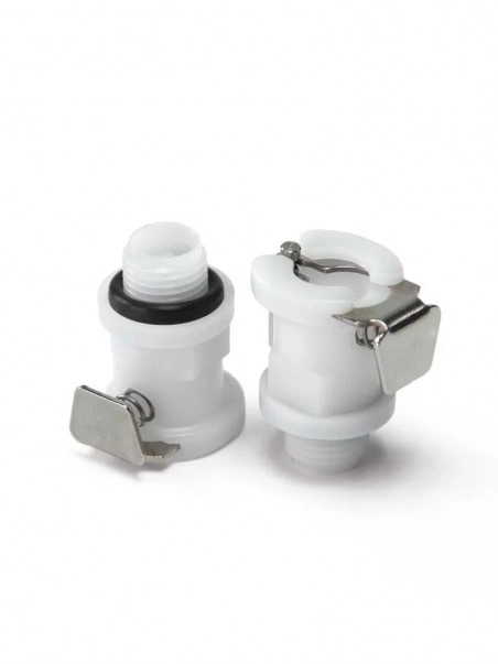 Connecteur de rechange. La partie haute est pru00e9vue pour clipser l’adaptateur reliu00e9 au tuyau. La partie basse est filetu00e9e et se visse sur un de nos cylindres u00e0 pu00e9nis.