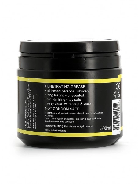 Fist Butter est une graisse pénétrante à base d’huile conçue pour les jeux sexuels hards. La graisse est onctueuse et fondante. Elle tapisse généreusement le trou et reste bien en place, favorisant une lubrification optimale. Notre « ‘beurre de poing » est idéal pour le travail manuel et parfait pour les jouets. Fist butter est recommandé pour le fist-fucking large, profond et intense et l’utilisation de gros godes. La grande contenance du pot, 500 ml, permet un usage prolongé. La graisse n’est pas compatible avec le latex en raison de sa base d’huile.