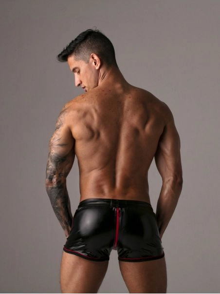 L’extérieur du short est fait d’un tissu extensible lisse et brillant, imitant le cuir. Le short est doublé d’un tissu doux pour éviter le contact du pvc avec la peau et optimiser le confort. La coupe est étudiée pour garder une pleine aisance de ces mouvements. La ceinture élastique est soutenue par un cordon de serrage.