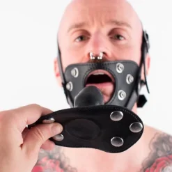 Le bu00e2illon est en cuir. Le plug d’une longueur de 5 cm est en caoutchouc. Cet u00e9lu00e9ment s’adapte u00e0 la museliu00e8re en cuir ou au harnais de tu00eate (vendus su00e9paru00e9ment).