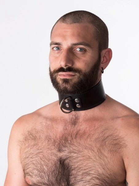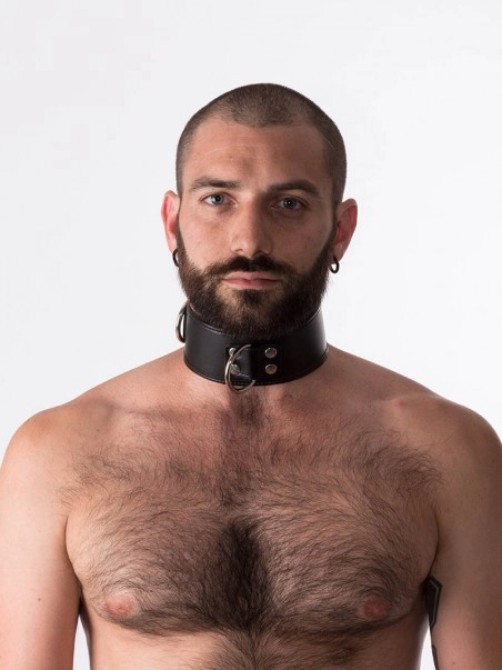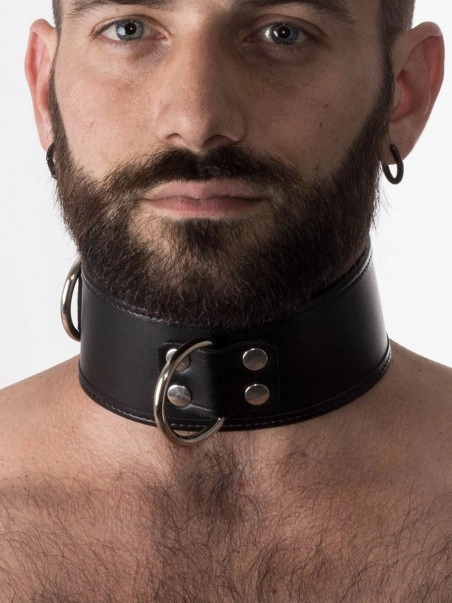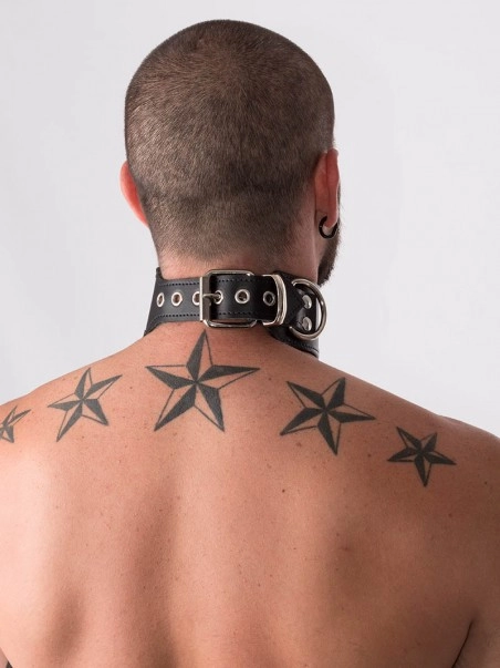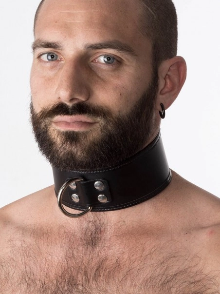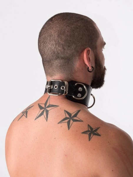 Collier en cuir hauteur 5.5 cm. Un anneau en D comme point du2019attache devant est pru00e9vu. Fermeture u00e0 lu2019arriu00e8re par 1 boucle.