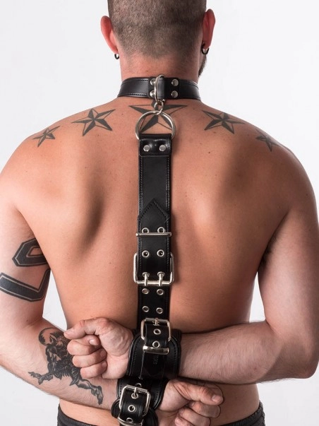Le collier, les menottes et la courroie peuvent u00eatre ajustu00e9s individuellement par les boucles. Une courroie en cuir est rivetu00e9e aux menottes.