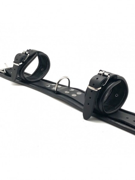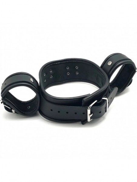 Le collier et les menottes sont fabriquées dans un cuir de qualité, épais et robuste dont les bords sont doublés, favorisant un certain confort du soumis dans la contrainte, aux deux poignets et au cou.