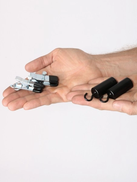 Ce kit ajoute une nouvelle dimension u00e0 vos jeux de tu00e9tons. Il est composu00e9 de deux poidsu00a0et de deux pinces mu00e9talliques. Les poids garantissent une sensation douloureuse u00e9rotique.
